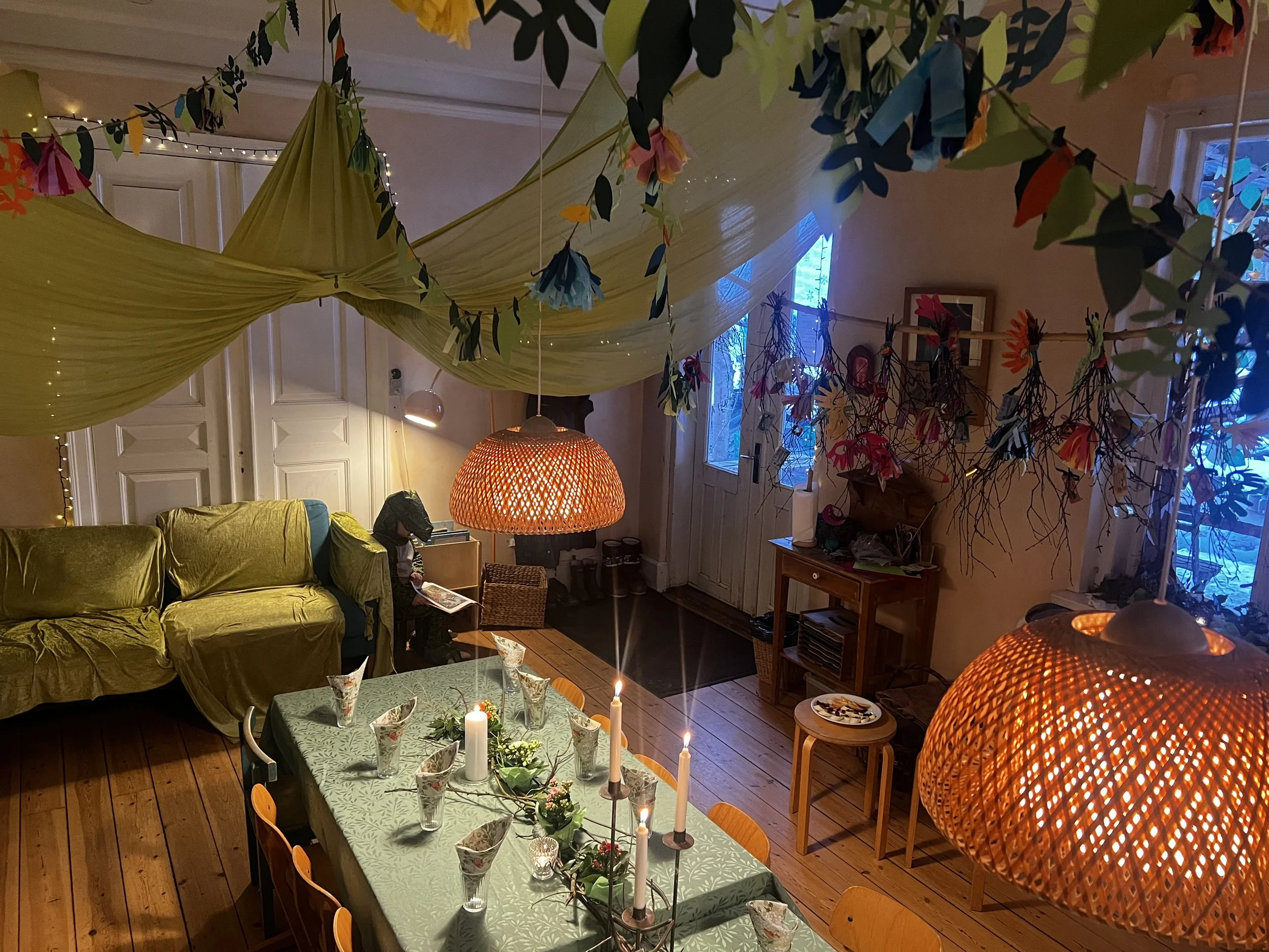 Til denne fest, som vi holder omkring 1. december, har vi lagt en stor granspiral på gulvet i børnehaven, i midten står et stort lys tændt. Vi har pudset røde æbler og sat bivokslys i, og med dem går vi, én efter én, ind i spiralen og tænder vores lys ved det store, en fin og inderlig optakt til julemåneden.